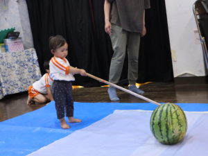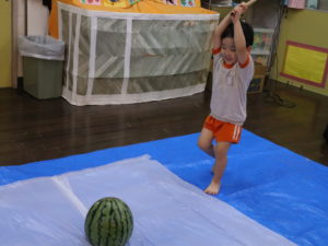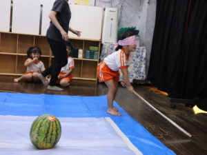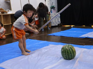 「右右右」「左左左」「前前前」「ちが~う」とみんな教え合っていましたが、なかなかスイカに当たらず。
