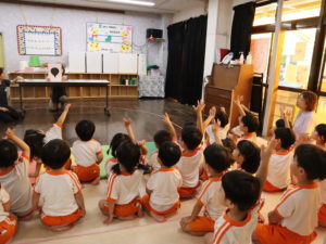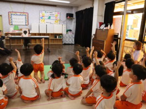 小さいクラスのお友達は目隠しをせず、大きいクラスのお友達は目隠しをしてチャレンジ。