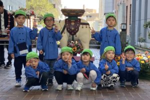 甘茶をかけてお釈迦様のお祝いをしたり、アーケードに来ているお客さんに花まつりのリーフレットや甘茶などを配りました。ちょっぴり恥ずかしそうなみどりぐみさんでした。